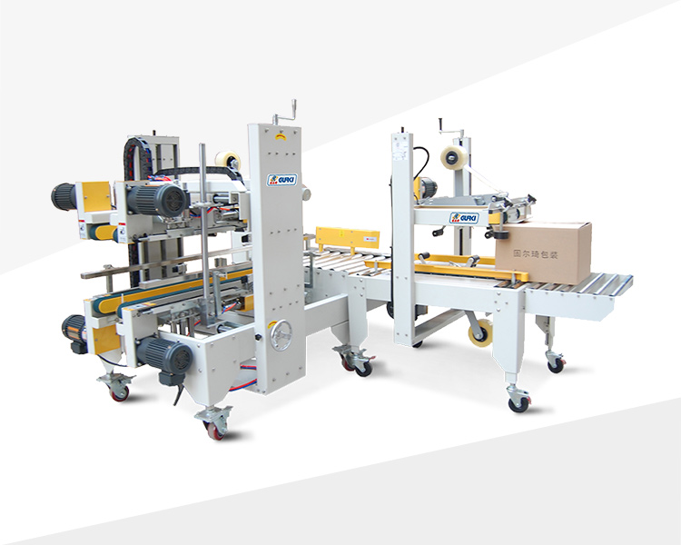 角邊膠帶封箱機(jī)GPB-56+GPG-50的,適用多種紙箱規(guī)格,僅需手工調(diào)節(jié)寬度及高度,方便、快速;90°轉(zhuǎn)角機(jī),氣缸自動(dòng)推箱;紙箱上下四個(gè)角邊同時(shí)自動(dòng)封箱、撫平、快速、平穩(wěn);可與GPA/GPB/GPC機(jī)型聯(lián)機(jī)組合完成工字型封箱機(jī)。